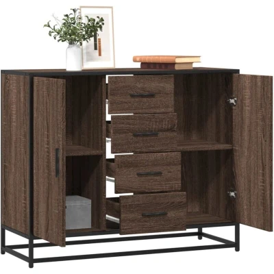 ManoManoGeneral description This sideboard with a practical design is a real eye-catcher for your home decor. It features a stable and durable construction, making it a reliable choice for various settings. Technical specifications Colour: Brown oak Material: Engineered wood, metal Dimensions: 92 x 35 x 76 cm (W x D x H) Maximum load capacity (top): 30 kg Maximum load capacity (each drawer): 3 kg Maximum load capacity (each compartment): 20 kg Maximum load capacity (total): 60 kg With 4 compartments with doors and 4 drawers Assembly required: Yes Usage Ample storage space for keeping various daily essentials well organized and within easy reach. Versatile and suitable for bedrooms, living rooms, hallways, and more. Easy to clean with a damp cloth due to its smooth surface. Other information Warning: To prevent it from tipping over, this product must be used with the provided wall attachment device. SKU: 3300829