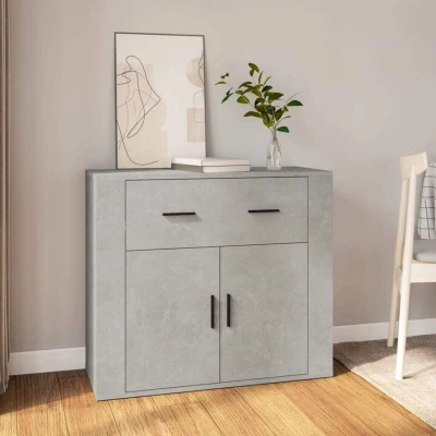 ManoManoGeneral description This practical sideboard is designed to meet various requirements and serves as an ideal addition to your room. It features a modern concrete grey finish that complements any decor. Technical specifications Material: Engineered wood Dimensions: 80 x 33 x 70 cm (W x D x H) Colour: Concrete grey Usage Ample storage space with compartments and drawers for organizing daily essentials. Sturdy top surface suitable for displaying photos, decorations, or flowers. Doors to protect contents from dust and dirt. Other information Warning: To prevent overturning, this product must be used with the wall attachment device provided. Each product comes with an assembly manual in the box for easy assembly.