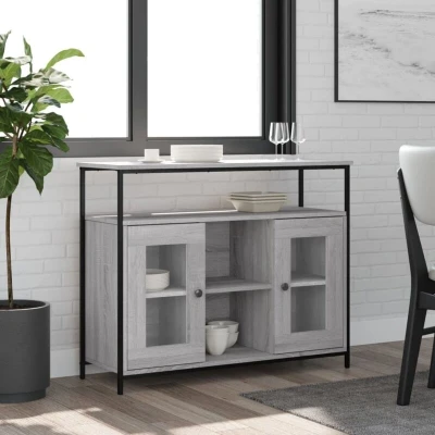 ManoManoGeneral description This classic sideboard, featuring a timeless look, is an excellent addition to your home. It is designed to provide ample storage space for your daily essentials while also serving as a display area for decorative items, photo albums, or small plants. Technical specifications Colour: Grey sonoma Material: Engineered wood, steel, glass Dimensions: 100 x 35 x 80 cm (W x D x H) Assembly required: Yes Installation To prevent it from being overturned, this product must be used with the provided wall attachment device. Usage The engineered wood is of exceptional quality, featuring a smooth surface that is easy to clean with a damp cloth. Four adjustable feet with plastic pads keep the storage furniture balanced on uneven ground and increase stability. Other information