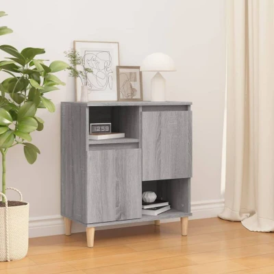 General description This stylish sideboard is a perfect choice for your room with its trendy and practical design. The engineered wood is of exceptional quality, featuring a smooth surface along with strength, stability, and moisture resistance. The solid eucalyptus wood feet provide a natural and pleasant look while ensuring stability. This cabinet has 4 compartments and 2 doors to keep your essentials well organized and within reach. The top of the cupboard is great for displaying decorative items, photo albums, or small plants. You can use this side cabinet as a bathroom cabinet, kitchen cupboard, or as an elegant storage solution in bedrooms, powder rooms, entryways, corridors, offices, dining rooms, and other living areas. Technical specifications Colour: Grey sonoma Material: Engineered wood, solid eucalyptus wood Dimensions: 60 x 35 x 70 cm (L x W x H) Flexible door installation Assembly required: Yes Other information Warning: To prevent it from being overturned, this product