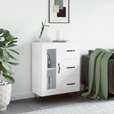 General description This classic sideboard has a timeless look, making it a perfect addition to your home. The engineered wood is of exceptional quality with a smooth surface, providing strength, stability, and resistance to moisture. Featuring 3 drawers and 2 compartments behind the glass door, the sideboard cabinet offers ample space for keeping your daily essentials organized and within reach. The sturdy top is ideal for displaying decorative items, photo frames, and potted plants, while the practical door keeps your essentials free from dust. Technical specifications Colour: High gloss white Material: Engineered wood, metal, glass Dimensions: 69.5 x 34 x 90 cm (W x D x H) Assembly required: Yes Other information Warning: To prevent it from being overturned, this product must be used with the provided wall attachment device. Images: