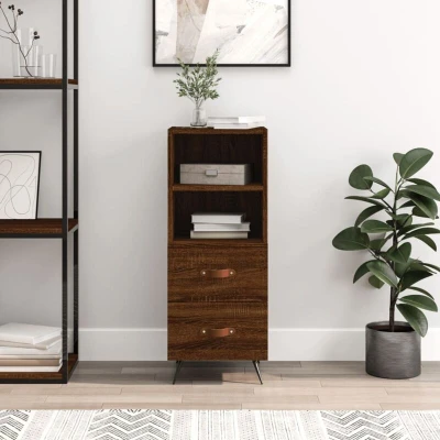 ManoManoGeneral description This modern sideboard, featuring a timeless look, is an excellent addition to your home. It is designed with durability and style in mind, making it a perfect choice for any interior. Technical specifications Colour: Brown oak Material: Engineered wood, metal Overall dimensions: 34.5 x 34 x 90 cm (L x W x H) Assembly required: Yes Usage Ample storage space with 2 drawers and 2 compartments to keep items organized and within easy reach. The stable and sturdy top is perfect for displaying decorative items, picture frames, and potted plants. Other information Warning: To prevent it from being overturned, this product must be used with the provided wall attachment device.