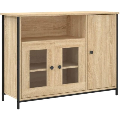 ManoManoGeneral description This classic sideboard, featuring a timeless look, is an excellent addition to your home. Made from high-quality engineered wood, it offers durability and a smooth surface, making it easy to clean with a damp cloth. The sideboard provides ample storage space for organizing your daily essentials and is perfect for displaying decorative items, photo albums, or small plants. Technical specifications Colour: Sonoma oak Material: Engineered wood, steel, glass Dimensions: 100 x 35 x 75 cm (W x D x H) Assembly required: Yes Other information Four adjustable feet with plastic pads ensure stability on uneven ground. Warning: To prevent it from being overturned, this product must be used with the provided wall attachment device. Images: