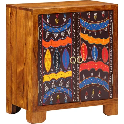 ManoManoGeneral description This multicolour sideboard combines decorative appeal with practical storage, making it an excellent addition to any home. Crafted from solid acacia wood, it is known for its strength and durability, featuring unique grain patterns and vibrant hand-painted designs that enhance your home decor. Technical specifications Colour: Multicolour Material: Solid acacia wood with honey brown finish, engineered wood Dimensions: 50 x 35 x 60 cm (W x D x H) With 2 doors Assembly required: Yes SKU: 4016498 Usage Can be used as a bathroom cabinet, kitchen cupboard, or elegant storage cabinet in bedrooms, powder rooms, entryways, corridors, offices, dining rooms, and other living areas. Other information Each item is unique with variations in colours and grains, ensuring exclusivity. Warning: To prevent tipping, this product must be used with the provided wall attachment device.