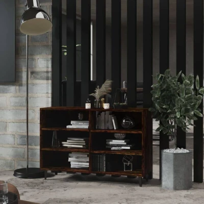 General description This sideboard, featuring an industrial style, is an ideal complement for your room with its practical utility. It has metal legs and a sturdy construction, making it exceedingly durable. With 6 shelves, the side cabinet provides ample storage space for books, multimedia appliances, and other items. The sturdy tabletop is also perfect for displaying decorative objects, photo frames, or potted plants. Additionally, the storage cabinet is easy to clean with a damp cloth. Technical specifications Colour: Smoked oak Material: Engineered wood, metal Dimensions: 103.5 x 35 x 70 cm (W x D x H) With 6 shelves Assembly required: Yes WARNING: In order to prevent overturning, this product must be used with the wall attachment device provided Other information