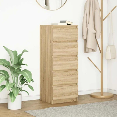 ManoManoGeneral description The sideboard with drawers in Sonoma Oak offers ample storage space, helping to keep your room tidy and organized while combining practicality with aesthetics. Its versatile design makes it suitable for various rooms, whether as a stylish storage solution in the living room, a functional addition to the dining area, or a practical organizer in the home office. Technical specifications Colour: Sonoma oak Material: Engineered wood Dimensions: 37.5 x 35 x 99 cm (W x D x H) Number of drawers: 5 Overall max. weight capacity: 60 kg Max. weight capacity of drawer: 5 kg Assembly required: Yes Installation To prevent tipping, this product must be used with the provided wall attachment device. Usage The sturdy tabletop can hold decorative items, photo albums, or small plants. Easy to maintain with a smooth surface that can be cleaned with a damp cloth. Other information