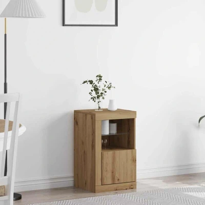 ManoManoGeneral description This stylish side cabinet is a clever way to keep things tidy while saving space. With a sleek design, it’s not just a storage unit; it’s also a snazzy piece of furniture that’ll wow your guests. The wall-mounted style makes it perfect for any living room. It offers ample storage, built-in lighting, and is made to last, making it a top pick for anyone seeking a modern storage solution. Technical specifications Colour: Artisan oak Material: Engineered wood Overall dimensions: 41 x 37 x 67 cm (L x W x H) Number of shelves: 3 Assembly required: Yes Power: DC 5V (USB power source not included) EAN: 8721158773869 SKU: 863020 Brand: vidaXL Usage The integrated board shelves are great for displaying trinkets or storing books and essentials. The built-in LED strip lights illuminate the cabinet's interior and can change colors to set the mood for different occasions. The practical hinge doors provide quick access to your stored items while keeping them out of sight for a