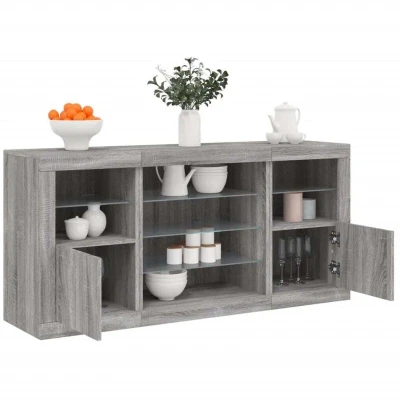 ManoManoGeneral description Enhance your living space with this modern sideboard featuring vibrant LED lights. Its sleek design allows it to blend seamlessly with various furniture styles, making it a versatile addition to any room. Technical specifications Color: Grey sonoma Material: Engineered wood, glass Overall dimensions: 142.5 x 37 x 67 cm (L x W x H) Weight: Not specified Assembly required: Yes USB connector: Requires a certified 5V USB power source (not included) Compatibility and accessories Includes 2 sideboards measuring 41 x 37 x 67 cm (L x W x H) Includes 1 sideboard measuring 60.5 x 37 x 67 cm (L x W x H) Installation To ensure safety, this product must be secured with the provided wall attachment device to prevent tipping over. Usage This sideboard is perfect for storing everyday items, keeping them organized and easily accessible. The sturdy top surface is ideal for displaying decorative objects, photo frames, or potted plants. Other information Warning: Do not use this item