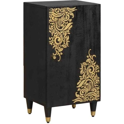 This elegant sideboard adds both style and practicality to your living room or dining area. Designed in a modern style, its clean lines and gold accents make it an eye-catching piece, while its sturdy solid mango wood construction ensures longevity. The simplistic yet functional design of this sideboard makes it a perfect addition for those seeking a sleek furniture piece that offers ample storage. Sturdy Materials: Constructed from high-quality solid mango wood, this sideboard offers durability and a natural touch to your home. Its robustness makes it a reliable choice for heavy storage purposes, and its fine grain structure adds a touch of rustic elegance. Decorative Gold Accents: With intricate gold screen-printed designs on its exterior, it brings a luxurious touch to your interiors. These highlights are perfectly complemented by the lustrous brass hardware, which emphasizes its contemporary appearance. Functional Brass Components: Equipped with sleek brass knobs and supported by strong brass legs, the sideboard provides both aesthetic appeal and functional support. The brass components are built to withstand daily use, contributing to the sideboard's longevity. Efficient Door Design: Featuring a hinged door mechanism, the sideboard offers accessible storage, allowing you to store and organize your items conveniently. The door opens smoothly and closes securely, maintaining the sideboard's streamlined look. Easy Maintenance: To maintain its luster, simply wipe the sideboard with a dry cloth. This ensures the sideboard retains its pristine appearance over time, without the need for extensive upkeep.