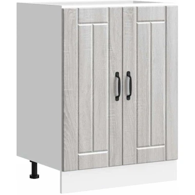 ManoManoGeneral description This sink base cabinet optimizes your kitchen space, providing ample storage for your personal belongings. It features practical doors that help maintain a clean and organized area by concealing kitchen appliances and clutter. Technical specifications Colour: Grey sonoma Material: Engineered wood Overall dimensions: 60 x 46 x 81.5 cm (L x W x H) Maximum weight capacity: 70 kg Weight capacity per layer: 20 kg Range name: Lucca With adjustable feet The worktop is not included in the delivery Assembly required: Yes Installation To prevent tipping, this product must be used with the provided wall attachment device. Screw(s) and plug(s) for inside the wall are not included; seek and use suitable screw(s) and plug(s) for your walls. If uncertain, seek professional advice. Read and follow each step of the instruction carefully. Usage Easy to maintain: Thanks to its smooth surface, this kitchen sink base unit is easy to clean with a damp cloth and requires less