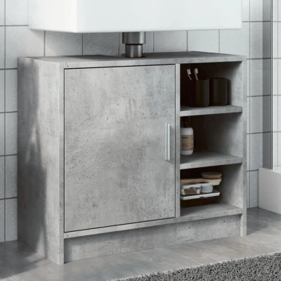 ManoManoGeneral description This sink cabinet is a great addition to your bathroom, providing a tidy and striking appearance. It is designed to offer ample storage space while maintaining a sleek look. Technical specifications Colour: Concrete grey Material: Engineered wood Dimensions: 63 x 29 x 55 cm (W x D x H) Maximum load capacity (total): 70 kg Assembly required: Yes Installation To prevent tipping, this product must be used with the provided wall attachment device. Usage The under sink cabinet features 1 compartment with 1 door and 3 open compartments, ideal for organizing daily essentials. The top of the cabinet is perfect for placing the sink. Easy to maintain with a smooth surface that can be cleaned with a damp cloth. Other information
