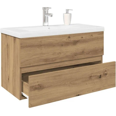 ManoManoGeneral description This stylish sink cabinet with a built-in basin and faucet features spacious storage, making it an excellent addition to your bathroom while providing a tidy and striking appearance! Technical specifications Sink cabinet: Colour: Artisan oak Material: Engineered wood Overall dimensions: 80 x 38.5 x 45 cm (W x D x H) Built-in basin: Colour: White Material: Ceramic Basin dimensions: 81 x 39 x 18 cm (L x W x H) Ceramic edge thickness: 4 cm Drain hole diameter: 4.5 cm With an overflow With faucet Push drainer with overflow function Assembly required: Yes Installation Screws and plugs for wall mounting are not included; use suitable ones for your walls. If uncertain, seek professional advice. Read and follow each step of the instruction carefully. Usage The faucet is a hot and cold tap; a water heater must be connected for hot water. Children should be supervised to ensure they do not play with the appliance. Keep children away from the assembly area. Other information