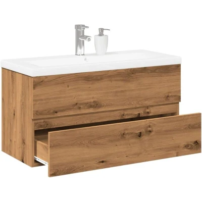 ManoManoGeneral description This stylish sink cabinet with a built-in basin features spacious storage, making it an excellent addition to your bathroom for a tidy and striking appearance. The cabinet can be wall-mounted to maximize floor space and keep the area clean. Technical specifications Sink cabinet: Colour: Artisan oak Material: Engineered wood Dimensions: 90 x 38.5 x 45 cm (W x D x H) Built-in basin: Colour: White Material: Ceramic Overall dimensions: 91 x 39.5 x 18.5 cm (L x W x H) Ceramic edge thickness: 4 cm Drain hole diameter: 4.5 cm With an overflow Assembly required: Yes Usage The sink cabinet is designed for practical use in the bathroom, providing ample storage space with a drawer for organizing bathroom items. The top of the cabinet is ideal for placing the sink, and the overflow function ensures water flows out when it gets too full. Other information Screw(s) and plug(s) for inside the wall are not included; seek suitable options for your walls. The faucet is not included