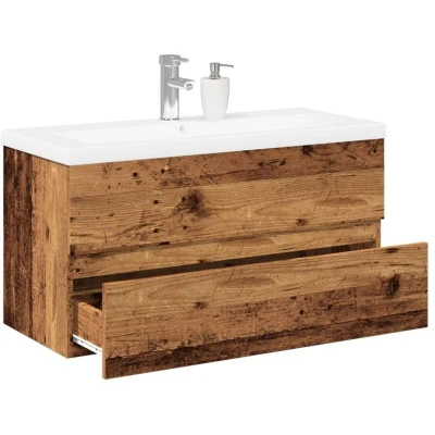 ManoManoGeneral description This stylish sink cabinet with a built-in basin features spacious storage, making it an excellent addition to your bathroom while providing a tidy and striking appearance. Technical specifications Sink cabinet: Colour: Old wood Material: Engineered wood Dimensions: 90 x 38.5 x 45 cm (W x D x H) Built-in basin: Colour: White Material: Ceramic Overall dimensions: 91 x 39.5 x 18.5 cm (L x W x H) Ceramic edge thickness: 4 cm Drain hole diameter: 4.5 cm With an overflow Assembly required: Yes Usage The top of this bathroom cabinet is ideal for placing the sink. The cabinet can be wall-mounted to maximize floor space and keep the area clean. An overflow is equipped to allow water to flow out when it gets too full. Other information Screw(s) and plug(s) for inside the wall are not included; use suitable screw(s) and plug(s) for your walls. If uncertain, seek professional advice. Read and follow each step of the instruction carefully. The faucet is not included in the