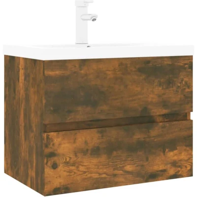 ManoManoGeneral description This stylish sink cabinet with a built-in basin, featuring spacious storage space, is an excellent addition to your bathroom, giving it a tidy and striking appearance! Technical specifications Sink cabinet: Colour: Smoked oak Material: Engineered wood Overall dimensions: 60 x 38.5 x 45 cm (W x D x H) Built-in basin: Colour: White Material: Ceramic Overall dimensions: 61 x 39 x 18.5 cm (L x W x H) Ceramic edge thickness: 4 cm Drain hole diameter: 4.5 cm With an overflow Compatibility and accessories Includes: 1 x Bathroom sink cabinet 1 x Built-in basin with faucet The faucet is a hot and cold tap; a water heater must be connected for hot water. Installation Screw(s) and plug(s) for inside the wall are not included; seek and use suitable screw(s) and plug(s) for your walls. Each product comes with an assembly manual in the box for easy assembly. If you are uncertain, seek professional advice. Usage Children should be supervised to ensure that they do not play with