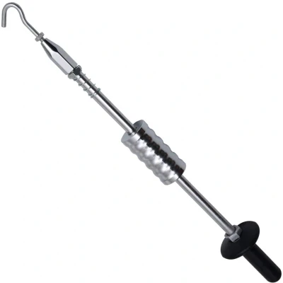 General description With the slide hammer with a hook, bumps and dents in bodyworks can be repaired effectively. It is the perfect tool for professional workshops, car painting shops, or workshops at home. The slide hammer is made from carbon steel and is placed upon the bodywork so that the dent puller effectively and effortlessly pulls out bumps and dents. The robust hook design allows for the removal of even severe dents thanks to the slide hammer's high pulling force. Through simple handling and direct usage possibilities, you can save time and money while repairing bodyworks. Technical specifications Material: Carbon steel, PP Total length: 63 cm Outside diameter: 49 mm Tube diameter: 16 mm Net weight: 2.3 kg Designed for dent pulling machine Other information