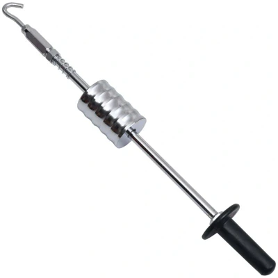 ManoManoGeneral description The slide hammer with a hook is an effective tool for repairing bumps and dents in bodyworks. Ideal for professional workshops, car painting shops, or home use, this tool is designed to effortlessly pull out even severe dents thanks to its robust hook design and high pulling force. Technical specifications Material: Carbon steel, PP Total length: 65 cm Outside diameter: 68 mm Tube diameter: 16 mm Net weight: 3.7 kg Designed for dent pulling machine Other information