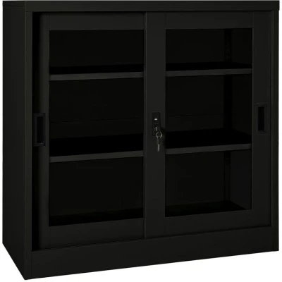Remove all your clutter in the office with this sliding door cabinet! The storage cabinet is made of steel and tempered glass, making it exceeding sturdy and durable. The sliding door ensures smooth opening and closing. With 2 adjustable shelves, the cabinet is suitable for storing files of different size. The filing cabinet also features a lock to protect your personal documents from unwanted guests. Sliding door cabinets are suitable for rooms with limited amount of spaces or small aisles, in which there is no possibility to use cabinets with swinging doors. Colour: Black Material: Steel, tempered glass Dimensions: 90 x 40 x 90 cm (W x D x H) Features sliding doors 2 adjustable shelves With a lock Loading capacity per shelf: 30 kg Total loading capacity: 60 kg Assembly required: Yes WARNING : In order to prevent overturning, this product must be used with the wall attachment device provided. Legal Documents: More details about preventing your furniture from tipping over can be found