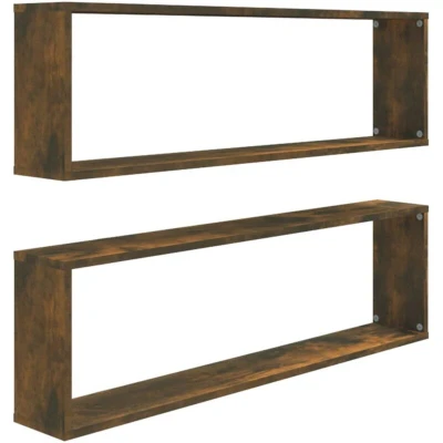 ManoManoGeneral description These wall cube shelves are designed to be mounted on the wall, adding a stylish touch to any room. Made from high-quality engineered wood, they offer durability and a smooth surface, making them both functional and decorative. Technical specifications Material: Engineered wood Colour: Smoked oak Dimensions: 100 x 15 x 30 cm (W x D x H) Delivery contains: 2 x Wall shelf Installation Screw(s) and plug(s) for mounting are not included; use suitable ones for your walls. Each product comes with an assembly manual for easy installation. If uncertain, seek professional advice. Follow each step of the instruction carefully. Usage These wall-mounted shelves feature open compartments, perfect for storing and displaying books, awards, collectibles, and ornaments. They can easily transform an empty wall into a design feature. Other information