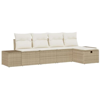 ManoManoGeneral description This Garden Sofa Set is the ultimate in modern outdoor living, mixing great style with practicality. It’s designed to jazz up any garden or patio, providing a welcoming spot for relaxation or socializing, making it ideal for homes that love to entertain. With its clean lines and smooth poly rattan surface, it looks sleek and fits perfectly with your outdoor vibe. Whether lounging with family on a sunny day or hosting friends for an evening under the stars, its versatility is exceptional. Technical specifications Colour: Beige Material: Poly rattan Overall dimensions: 55 x 62 x 69 cm (L x W x H) Number of items: 5 Assembly required: Yes EAN: 8721288408112 SKU: 3360692 Compatibility and accessories 2 x Centre seat including storage function with a water-resistant bag 2 x Sofa including storage function with a water-resistant bag 1 x Footstool with storage function Installation This set requires some assembly, but it’s a straightforward process. Everything fits
