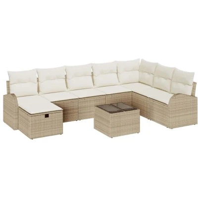 ManoManoGeneral description This garden sofa set, tailored for outdoor spaces like gardens and terraces, combines modern style with unmatched functionality. Its contemporary look is defined by clean lines and a minimalist aesthetic, making it the perfect addition to any outdoor setting. Its versatile configuration invites individuals and families to enjoy pleasant moments of relaxation under the sun or the stars, embodying the spirit of spring and summer seasons. Technical specifications Colour: Beige and cream Material: Poly rattan Overall dimensions: 289 x 179 x 85 cm (L x W x H) Weight: 62.5 kg Seating area: 55 x 55 cm (W x D) Frame material: Powder-coated steel Indoor / outdoor: Outdoor only Number of items: 9 Included Components 4 x Centre seats with storage 1 x Corner seat with storage 2 x Arm sofas with storage 1 x Footstool with storage 1 x Garden table Care & Maintenance Use a furniture cover when not in use during harsh weather conditions. Simple cleaning with a damp cloth can