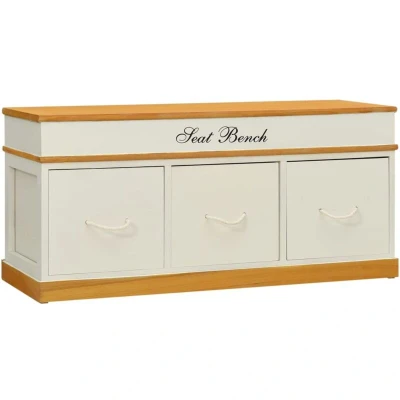 General description This storage bench, made of high-quality solid paulownia wood, features a simple yet stylish design. It not only provides ample storage space but also enhances your room decor. With three large drawers, this durable storage bench is perfect for storing shoes, trousers, and sweaters. It comfortably seats 2 to 3 adults, making it ideal for use in porches, coatrooms, and bedrooms. Technical specifications Material: Solid paulownia wood Total size: 100 x 35 x 45 cm (L x W x H) Drawer size: 30.5 x 30.5 x 25 cm (L x W x H) Maximum weight capacity: 110 kg per seat Number of drawers: 3 Other information
