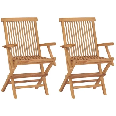 General description This teak garden chair set consists of 2 pieces and will make a great addition to your garden, terrace, or patio for chatting with family and friends or just enjoying the weather. Constructed from extremely durable teak hardwood, this furniture has been seasoned, kiln dried, and fine sanded for a smooth appearance. Teak wood is known for its exceptional strength and weather resistance, making it an ideal choice for long-lasting garden furniture. The ergonomic design of the seats and backrests enhances sitting comfort, while the lightweight construction allows for easy movement. The chairs can be folded to save space when not in use. Technical specifications Material: Fine sanded teak hardwood with water-based finish Size: 55 x 60 x 89 cm (W x D x H) Seat width: 45 cm Seat depth: 37 cm Seat height from the ground: 45 cm Armrest height from the ground: 66 cm Maximum weight capacity: 110 kg per seat With armrests Foldable for easy storage Other information