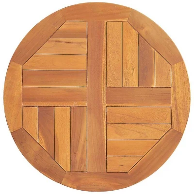 ManoManoGeneral description With a simple and clean look, this wooden table top will add a rustic charm to your dining areas. Constructed from extremely durable teak hardwood, this piece has been seasoned, kiln dried, and fine sanded to provide a smooth appearance. Teak wood is known for its exceptional strength and weather resistance, making it an ideal choice for garden furniture. Additionally, you can combine this top with any styled table legs according to your specific needs. Technical specifications Material: Fine sanded teak hardwood with water-based finish Diameter: 50 cm Thickness: 2.5 cm Slats with 4 direction style Other information