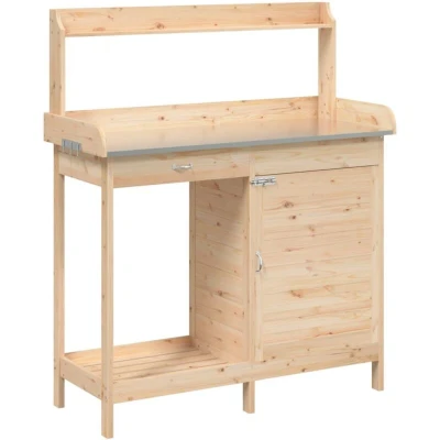 ManoManoGeneral description This wooden potting table is perfect for organizing and displaying your potted plants at home, in a garden, on a patio, or on a terrace. Made of solid fir wood, it offers sturdiness and stability while maintaining its integrity even when exposed to moisture. The potting bench features a versatile storage space with a top rail, a bottom shelf, a drawer, a storage cabinet, and metal hooks on the side, providing ample room for gardening tools, soil, fertilizers, and more. The zinc-covered tabletop ensures better water resistance and durability, making it easy to clean. Additionally, the slat design of the bottom shelf allows for water flow, preventing rot and ensuring a long service life. Technical specifications Material: Solid fir wood (untreated) Dimensions: 110.5 x 45 x 124.5 cm (L x W x H) Worktop size: 107 x 43 cm (L x W) Drawer inner dimensions: 49 x 36.5 x 6 cm (W x D x H) Cabinet inner dimensions: 40 x 40 x 57 cm (W x D x H) Tabletop height: 84 cm Maximum