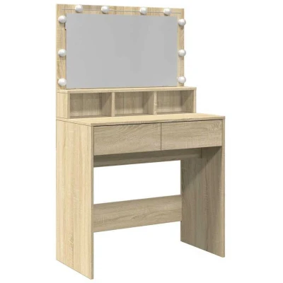 ManoManoGeneral description The dressing table is a stylish addition to your bedroom decor, providing a convenient space to keep your cosmetics organized and easily accessible. It features a beautiful mirror and LED lighting that enhances your beauty while applying makeup. Technical specifications Color: Sonoma oak Material: Engineered wood, glass Dimensions: 80 x 41 x 134.5 cm (W x D x H) Maximum load capacity: 35 kg Storage: 2 drawers and 3 compartments Assembly required: Yes Usage The LED bulbs around the mirror can be switched between warm and cold white, providing optimal lighting for makeup application. To prevent tipping, the dressing table must be secured using the provided wall attachment device. Other information