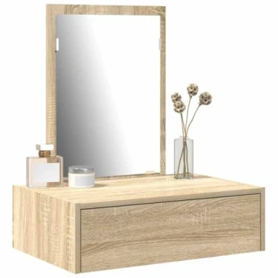 vidaXL Sonoma Oak Wall Mounted Vanity Unit Beige Particle Board Makeup Station with Mirror and Drawer for Bedroom Storage