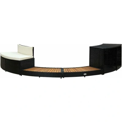 General description This stylish poly rattan hot tub surround is a versatile accessory for your spa. It gives the spa a chic and modern look while creating a more functional and user-friendly spa area. Featuring a built-in storage area, the spa surround keeps all the essentials organized and within easy reach. The robust steel frame and weatherproof acacia wood with an oil finish can withstand heavy traffic and is highly durable. It includes a mini sofa with a cushion for maximum relaxing comfort. You are sure to value the convenience, durability, and the wicker styling of this tub surround! Technical specifications Colour: Black Material: Solid acacia wood with an oil finish, poly rattan, steel Dimensions: 289 x 124 x 56 cm (L x W x H) Mini sofa dimensions: 107 x 45 x 56 cm (W x D x H) Inner diameter: 201 cm Assembly required: Yes Other information