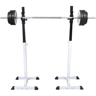 General description This robust and stable barbell rack set is perfect for your home gym! In combination with a barbell bench, it is suitable for barbell training, squats, or as a supplement to a barbell bench. Technical specifications Stable barbell rack for barbells with a diameter of about 45mm and 50mm Rugged steel construction with a max load of 80 kg Height adjustable from 107 cm to 165 cm Compact and space-saving design Very stable with non-slip legs 12 adjustable levels Net weight: 15.5 kg Dimensions: 50 cm x 48 cm x 107 - 165 cm (L x W x H) Main tube dimensions: 50 x 50 x 1.5 mm Color: White / Black Usage Suitable for beginners through to advanced athletes Read the manual carefully before using the product If you have health concerns, consult a doctor before training Stop training if you experience discomfort such as headache, chest tightness, irregular heartbeat, shortness of breath, dizziness, or nausea Other information