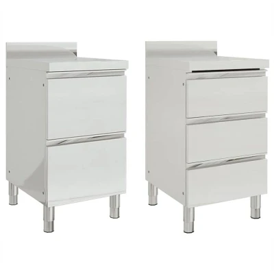 General description If you want to keep your kitchen supplies organized, the commercial kitchen cabinet is a perfect choice. It can be widely used in restaurants, hotels, food production, gastronomy, garages, workplaces, and home use. Made of quality stainless steel, this storage cabinet is robust, anti-corrosive, and easy to clean. The cabinet provides ample storage space for cleaning equipment and accessories, and the adjustable feet ensure it remains level on uneven floors. A 10 cm backsplash and water pipe hole are also included. Technical specifications Colour: Silver Material: Stainless steel Dimensions: 50 x 60 x (95-96) cm (W x D x H) With a 10 cm backsplash Food grade stainless steel Height-adjustable legs to fit uneven ground Assembly required: Yes Other information Delivery contains: 1 x Kitchen cabinet (2 drawers with smooth rails) 1 x Kitchen cabinet (3 drawers with smooth rails) WARNING: In order to prevent overturning, this product must be used with the wall attachment