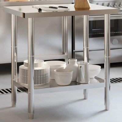 VidaXLThis kitchen work table is perfect for food prep and storage and is ideal for a kitchen bar, restaurant, school, as well as other commercial places. Durable and stable construction: The work table is made of stainless steel, providing resistance to corrosion and rust for years of reliable use. The smooth surface is easy to clean and maintain, ensuring a hygienic food preparation area.Ample workplace: The stainless steel prep table is designed with a bottom shelf for customised storage space, providing ample storage space for your microwave oven, kitchen utensils, or any other tools you may need.Adjustable feet: The adjustable feet with a non-slip design ensure the kitchen prep table remains stable and will stay put, protecting the floor from damage. Warning:To prevent it from tipping over, this product must be used with the provided wall attachment device.