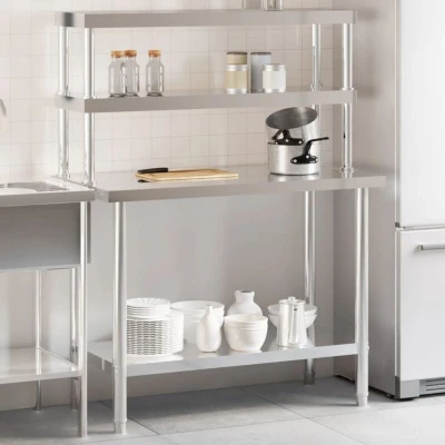 VidaXLThis kitchen work table is perfect for food prep and storage and is ideal for a kitchen bar, restaurant, school, as well as other commercial places. Durable and stable construction: The work table is made of stainless steel, providing resistance to corrosion and rust for years of reliable use. The smooth surface is easy to clean and maintain, ensuring a hygienic food preparation area.Ample workplace: The stainless steel prep table is designed with a bottom shelf and a 2-tier overshelf for customised storage space, providing ample storage space for your microwave oven, kitchen utensils, or any other tools you may need.Adjustable feet: The adjustable feet with a non-slip design ensure the kitchen prep table remains stable and will stay put, protecting the floor from damage. Warning:To prevent it from tipping over, this product must be used with the provided wall attachment device.