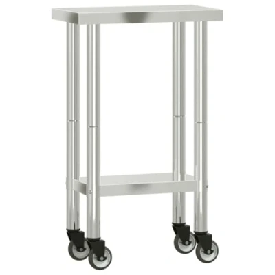 vidaXL Stainless Steel Kitchen Work Table with Wheels 55x30x85 cm, Silver, Mobile Prep Station Storage Shelf for Commercial Use