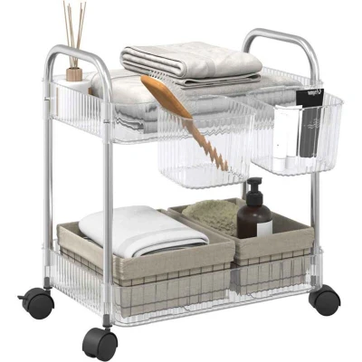 ManoManoGeneral description This storage trolley offers an ideal solution for organizing various spaces including your kitchen, living room, bathroom, laundry room, and office. Made from robust acrylic baskets and a stainless-steel frame, this storage cart is lightweight, stable, and durable. It can help keep items like food, books, toiletries, and office supplies neatly stored and easily accessible. Technical specifications Colour: Transparent and silver Overall dimensions: 37 x 28 x 43.5 cm (L x W x H) Material: Acrylic and stainless steel Basket dimensions: 37 x 27.5 x 6 cm (L x W x H) Storage box dimensions: 12 x 11 x 10 cm (L x W x H) Max. load capacity per tier: 5 kg 2-tier design with 2 extra storage boxes 4 wheels (two of them are lockable) Assembly required: Yes Usage This storage trolley is equipped with four casters, two of which have brakes, allowing you to effortlessly relocate it to any desired spot and securely lock it in place for added control and safety. Designed with two