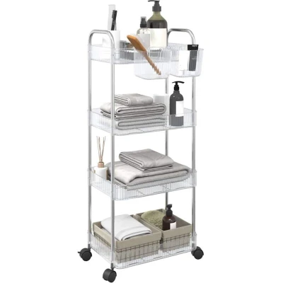 ManoManoGeneral description This storage trolley offers an ideal solution for organizing various spaces including your kitchen, living room, bathroom, laundry room, and office. Made from robust acrylic baskets and a stainless-steel frame, this storage cart is lightweight, stable, and durable. It features a versatile design that helps keep items like food, books, toiletries, and office supplies neatly stored and easily accessible. Additionally, it includes two extra hanging cups for storing small items, optimizing space utilization. Technical specifications Colour: Transparent and silver Overall dimensions: 37 x 28 x 95 cm (L x W x H) Material: Acrylic and stainless steel Basket dimensions: 37 x 28 x 6 cm (L x W x H) Storage box dimensions: 12 x 11 x 10 cm (L x W x H) Max. load capacity per tier: 5 kg 4-tier design with 2 extra storage boxes 4 wheels (two of them are lockable) Assembly required: Yes Usage This storage trolley is designed for versatile use in various settings. It can be