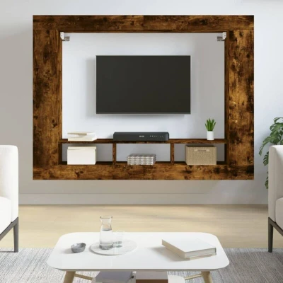 vidaXL Sturdy Wall Mounted TV Cabinet in Smoked Oak Engineered Wood Modern Living Room Media Unit with Storage Space and Display Shelves