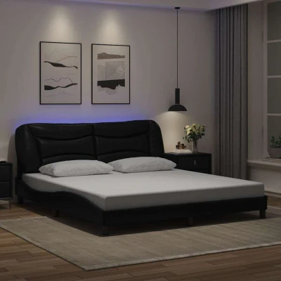 vidaXL Super King Bed Frame in Black Faux Leather with LED Lights, 180x200 cm Stylish Waved Design Durable Plywood Slats for Bedroom Elegance