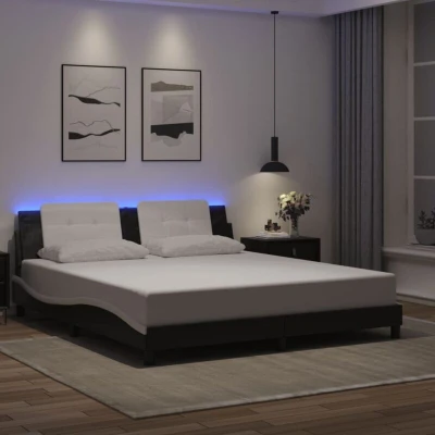 vidaXL Super King Faux Leather Bed Frame with LED Lights Black/White, Plywood Slats, Supportive Headboard