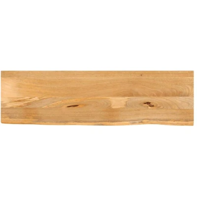 ManoManoGeneral description Give a new life to your table with this wooden table top. It is an excellent solution for freshening up your table at home or in a commercial setting. Made from solid mango wood, this table top is a strong, tropical hardwood that ensures durability. Its beautiful wood grains make every piece unique, showcasing a rustic live edge design that adds character to any space. Technical specifications Material: Solid mango wood with a natural finish Overall dimensions: 110 x 30 x 3.8 cm (L x W x T) Features 1 side live edge Each item is unique with variations in colours and grains Due to the natural shape of live edge solid wood, the width may vary slightly by +1-2 cm or –3-5 cm Other information