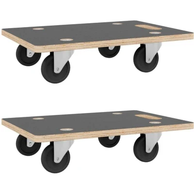 ManoManoGeneral description These transport trolleys are perfect for moving furniture, appliances, and general bulky items effortlessly, safely, and smoothly around your house or office. Technical specifications Material: Plywood with PF (phenol formaldehyde resins) covering, pp (polypropylene) Overall dimensions (each): 80 x 55 x 11.5 cm (L x W x H) Board thickness: 18 mm Caster diameter: 75 mm Maximum load capacity: 250 kg 4 wheels without lock Assembly required: Yes Delivery contains: 2 x Transport trolley Other information