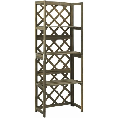 General description This wooden trellis makes a practical and decorative addition to your garden, balcony, or patio. Made of solid fir wood, it is sturdy and suitable for outdoor use, providing stable climbing support for roses and other climbing plants. The plant stand features three shelves for placing potted plants and garden ornaments. Technical specifications Colour: Grey Material: Solid fir wood Dimensions: 55 x 30 x 140 cm (W x D x H) Shelf size: 51 x 28 cm (W x D) Max. load capacity per shelf: 15 kg Assembly required: Yes Other information Never allow children to climb. There is a risk of tipping over if using the item without the anti-tip over kit.