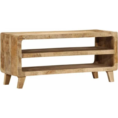 ManoManoGeneral description This TV cabinet with ample storage space is a practical and eye-catching addition to your living room or bedroom. Made from solid mango wood, a robust tropical hardwood, it offers exceptional durability and strength. Each piece features beautiful wood grains, making every item unique. Technical specifications Material: Solid rough mango wood Dimensions: 105 x 46 x 32 cm (W x D x H) Leg height: 10 cm Assembly required: Yes Usage Ample storage space for magazines, books, DVDs, and multimedia devices. Stable and sturdy tabletop suitable for placing your TV, stereo systems, or decorative items. Easy to clean with a damp cloth. Other information Each item is unique with variations in colors and grains. SKU: 4104523