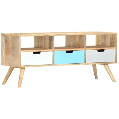 ManoManoGeneral description This solid wooden TV cabinet with a lacquered finish is a decorative and practical addition to your home decor. Handmade from solid mango wood, it is stable, durable, and features beautiful craftsmanship that enhances its retro style. Each piece is unique due to the natural variations in wood grains and colors. The cabinet includes a sturdy top for decorative items and offers ample storage with 3 drawers and 3 compartments. Technical specifications Colour: Brown and multicolour Material: Solid mango wood Dimensions: 110x35x48 cm (W x D x H) With 3 drawers and 3 compartments Finish: Polished, painted, and lacquered Assembly required: Yes Other information