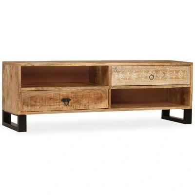 VidaXLThis antique-style wooden TV cabinet exudes industrial style, making it a unique addition to your current home decor. Rough mango wood: This TV stand is made of solid mango wood, a hardwood with dense grains. Solid mango wood not only has the strength to bear the weight but also stands the wear and tear of time.Powder-coated iron: The iron with the black powder coating finish of the TV unit provides extra stability.Ample storage space: The media cabinet has 3 drawers for storing knick-knacks and 1 shelf for keeping multimedia appliances, gaming consoles and magazines. Note:The colours may vary from piece to piece, making each piece unique and slightly different from the next. The delivery is random