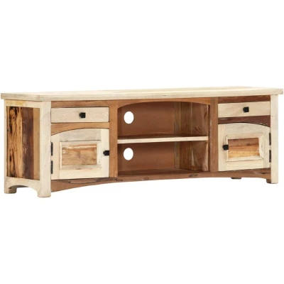 ManoManoGeneral description Introduce an air of mid-century elegance to your interior with our beautiful solid wooden TV cabinet! This HiFi cabinet is made of solid mango wood and reclaimed wood sourced from old buildings, ensuring each piece retains unique characteristics. The exquisite craftsmanship and graceful wood grains make every cabinet distinctive. This plasma cabinet features 2 doors, 2 drawers, and 2 compartments, providing an ideal solution for keeping your smaller items organized and within reach. The TV stand is easy to assemble. Technical specifications Material: Solid reclaimed wood, mango wood, MDF Dimensions: 120 x 30 x 40 cm (W x D x H) With 2 doors, 2 drawers, and 2 compartments Polished and lacquered Easy cable access Other information Important note: Colours and wood grains vary from piece to piece, making each TV cabinet unique. The delivery is random, ensuring the exclusivity and individuality of your product.