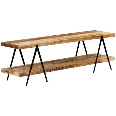 ManoManoGeneral description Introduce an air of rustic charm to your interior decor with our stylish wooden TV cabinet! This HiFi cabinet is made of solid mango wood, a hardwood known for its dense grains and durability. The rough mango wood is strong enough to bear weight and withstand the wear and tear of time. This beautifully designed side cabinet is stable, durable, and eye-catching, with exquisite craftsmanship that makes each piece distinctive. The cabinet features 2 shelves, providing ample space for storing multimedia appliances, books, and various other items. The powder-coated frame contributes to its sturdy construction and adds an industrial charm. Technical specifications Material: Solid mango wood and powder-coated iron Dimensions: 160 x 40 x 50 cm (W x D x H) Polished, painted, and lacquered With 2 shelves Fully handmade Other information Important note: The colors and grains vary from piece to piece, making each piece unique. The delivery is random, ensuring the exclusivity